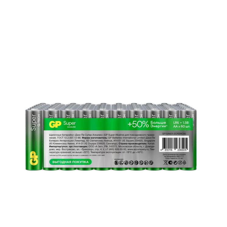 Батарейка GP AA (LR6, 15A) Super Alkaline 1.5V, плёнка 60 шт (SR60)
