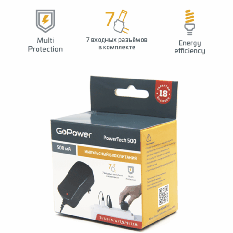 Универсальный импульсный блок питания GoPower PowerTech 500 предназначен для питания различных электронных устройств с максимальным потреблением тока до 500 мА. Благодаря регулируемому выходному напряжению и набору сменных разъемов, он совместим с широким спектром современной техники.