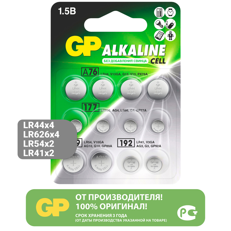 Набор алкалиновых батареек GP включает наиболее востребованные кнопочные элементы питания разных типоразмеров: LR44, LR66, LR54 и LR41. Подходит для широкого спектра устройств — часов, игрушек, калькуляторов, медицинских приборов и мелкой электроники.