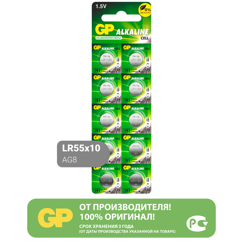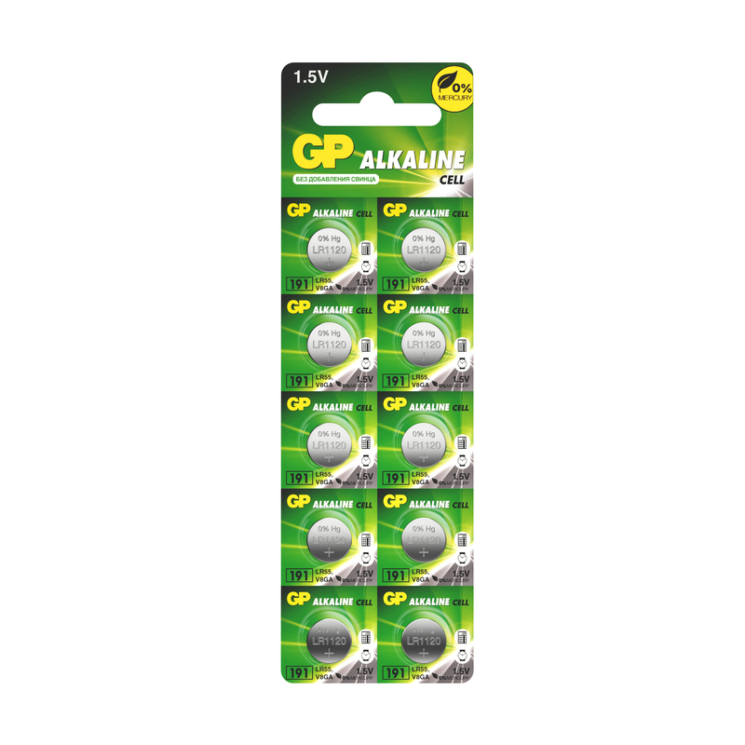 Начальное напряжение 1.5 В и номинальная ёмкость 24 мАч у такого элемента ниже, чем у серебряно-цинкового, но он имеет и более низкую стоимость. Батарейку GP 191 Alkaline Cell отличает низкое внутреннее сопротивление и длительный срок хранения – 3 года.