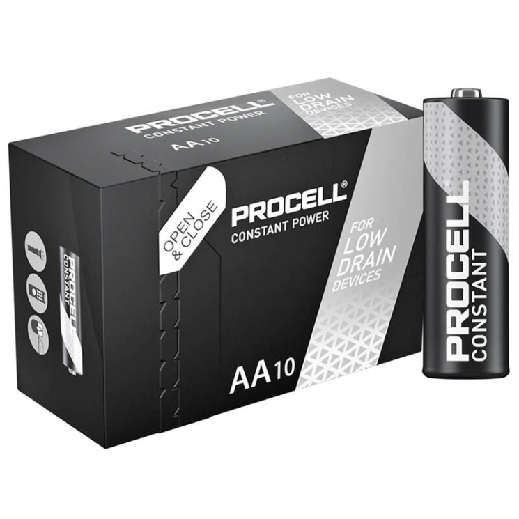 Батарейки Duracell Procell Constant Power LR6 10 штук в коробке обладают повышенной ёмкостью и обеспечивают надёжный долгий заряд. Могут использоваться в различных устройствах, таких как приборы телеметрии, пульты управления, беспроводные мыши, пульсоксиметры, цифровые термометры, системы безопасности и сигнализации, камеры видеонаблюдения, рации, фонарики, светильники и т.д.