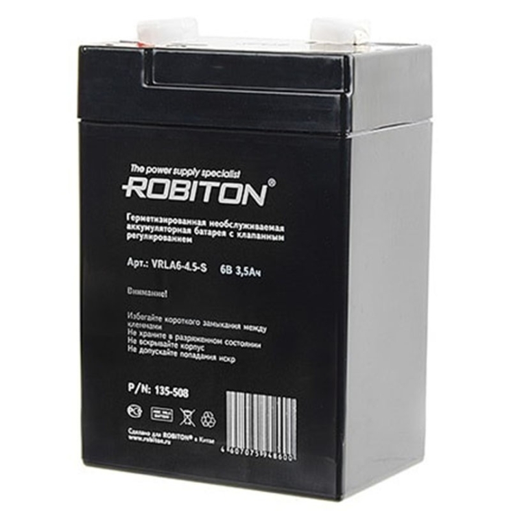 ROBITON – герметизированные свинцово-кислотные аккумуляторные батареи с клапанным регулированием:технология VRLA гарантирует полную герметичность и готовность батареи к работе. Аккумуляторы не требуют обслуживания.Широкий диапазон рабочих температур – номинальная рабочая температура составляет 20°С, но возможна работа в диапазоне от – 20°С до +50°С. Небольшой саморазряд – величина саморазряда составляет 2-3% в месяц при комнатной температуре. Надежность и абсолютная защищенность от утечки электролита, благодаря использованию технологии AGM (Absorbed Glass Mat).Существенные отличия VRLA6-4.5-S от VRLA6-4.5: размер: 70х47х100мм