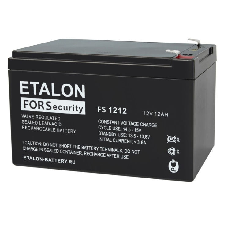 Аккумулятор 12 В 12 Ач, габариты 151*98*101 мм. Бюджетная серия, используется на малых токах разряда, преимущественно в буферном режиме. Основное применение: системы аварийного освещения, охранной и пожарной сигнализаций, портативная аппаратура. Не предназначен для работы в составе ИБП. Аккумулятор ETALON FS 1212 является стационарным свинцово-кислотным необслуживаемым и изготовлен по технологии AGM. Бюджетная серия FS спроектирована под применение в охранных и пожарных системах, системах освещения, контроля и доступа персонала.