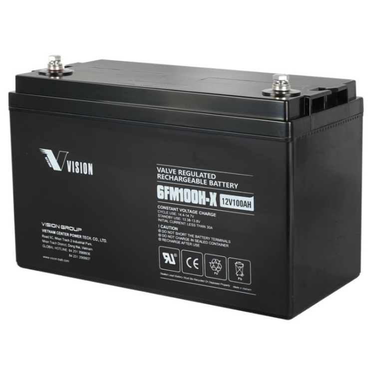 Аккумулятор 12 В 100 Ач, габариты 330*171*220 мм. Аккумулятор герметизирован, не нуждается в обслуживании и доливе воды, рекомендованный срок его использования – до 10 лет. Основное применение – мощные системы резервного и бесперебойного питания (например, устанавливается в ИБП APC, оборудование ЦОД, систем связи). Аккумулятор VISION 6FM100HX является стационарным свинцово-кислотным необслуживаемым и изготовлен по технологии AGM. Серия VISION FM спроектирована под применение в мощных источниках бесперебойного питания. Отличительная особенность – высокая надежность, устойчивость работы при циклическом режиме, превосходные разрядные характеристики на коротких временах разряда.
