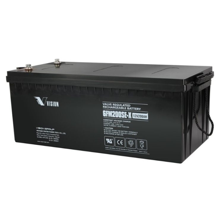 Аккумулятор 12 В 200 Ач, габариты 522*238*223 мм. Аккумулятор герметизирован, не нуждается в обслуживании и доливе воды, рекомендованный срок его использования – до 10 лет. Основное применение – мощные системы резервного и бесперебойного питания (например, устанавливается в ИБП APC, оборудование ЦОД, систем связи). Аккумулятор VISION 6FM200SE-X является стационарным свинцово-кислотным необслуживаемым и изготовлен по технологии AGM. Серия VISION FM спроектирована под применение в мощных источниках бесперебойного питания. Отличительная особенность – высокая надежность, устойчивость работы при циклическом режиме, превосходные разрядные характеристики на коротких временах разряда.