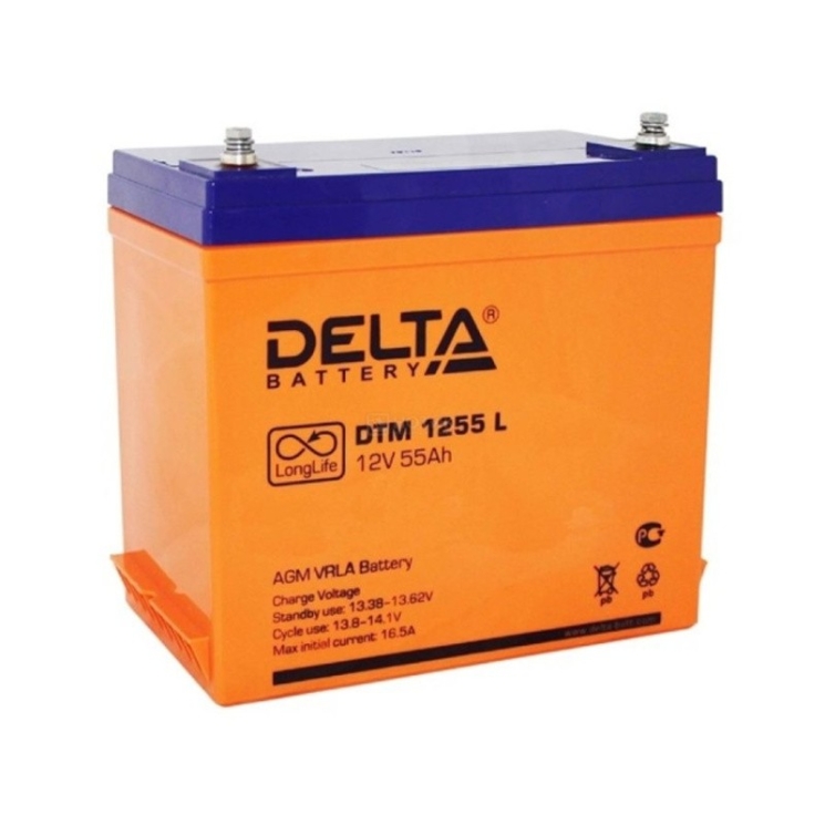 Герметизированный VRLA cвинцово-кислотный аккумулятор Delta DTM 1255 L напряжением 12В и емкостью 55Ач изготовлен по технологии AGM (с микропористым заполнителем, пропитанным электролитом). Корпус изготовлен из негорючего ABS пластика. Срок службы аккумулятора достигает 12 лет. Аккумулятор предназначен для работы в режиме постоянного подзаряда (буферный режим) или в режиме разряд-заряд (циклический режим). Обладает низким внутренним сопротивлением и саморазрядом.
