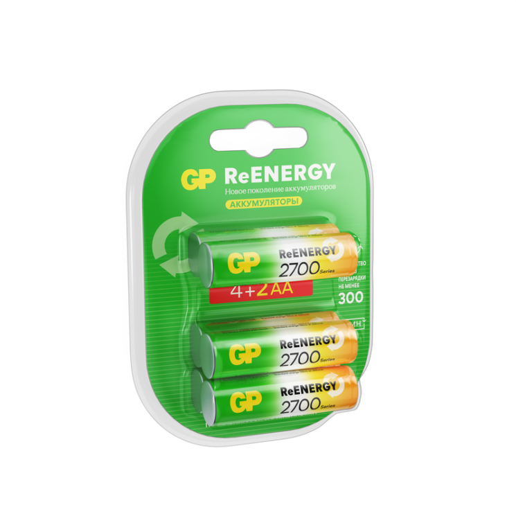 Аккумуляторы GP ReEnergy AA 2700mAh (набор 4+2) — ёмкие перезаряжаемые элементы питания для устройств с высоким энергопотреблением. Подходят для фотоаппаратов, вспышек, игрушек и бытовой электроники. Обеспечивают стабильное напряжение 1.2 В и рассчитаны на многократное использование.