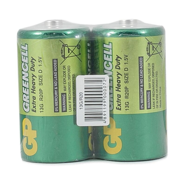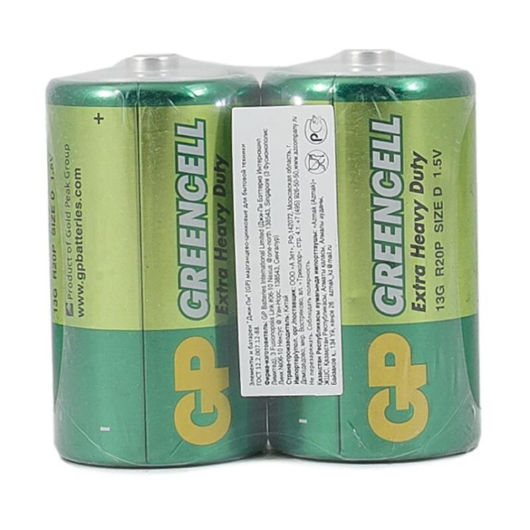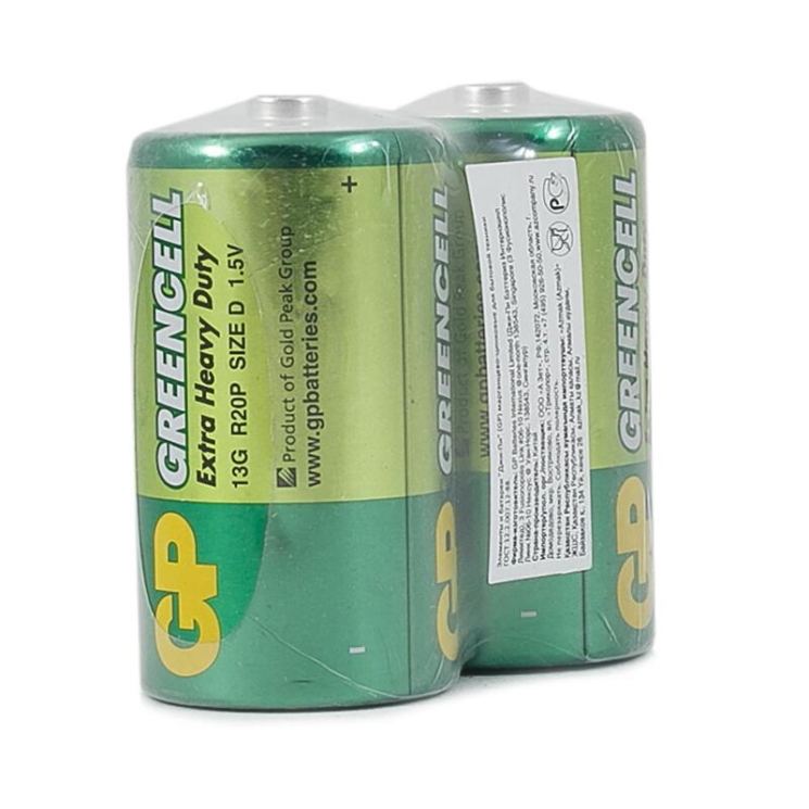 Солевая батарейка GP Greencell D (R20, 13G) — экономичный источник питания для устройств с низким и умеренным энергопотреблением. Подходит для фонарей, радиоприёмников, газовых колонок, игрушек и другой бытовой техники.