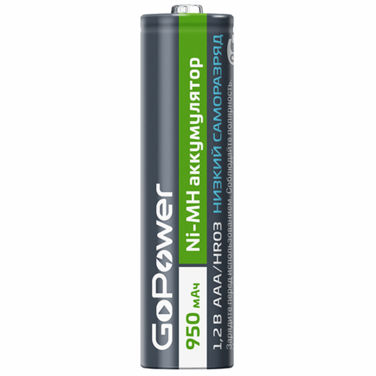 Ni-MH аккумулятор размера ААA/НR03 емкостью 950мАч. Ni-MH аккумуляторы GoPower с низким саморазрядом перезаряжаемы до 1000 раз и заменяют батарейки во всех современных устройствах. Изготовлены по технологии Ready-to-Use с использованием премиальных компонентов, поэтому поставляются уже заряженными и готовы к использованию сразу после покупки. Сохраняют до 80% заряда в течение не менее 2 лет хранения.