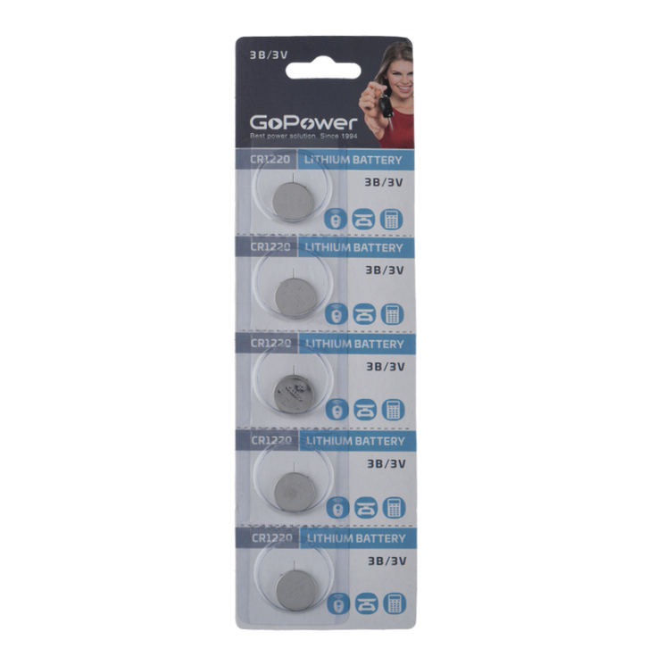 Элемент питания дисковой GoPower CR1220 5шт. Кнопочные элементы питания для часов и микроэлектроники. Батарейки 1220 предназначены для устройств, требующих стабильного напряжения на протяжении длительного срока службы: пульты ДУ, часы, роботизированная и фото техника, метеостанции и термометры.