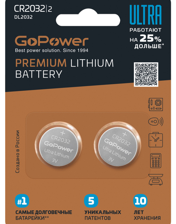 Литиевые батарейки GoPower ULTRA CR2032 Lithium 3V 2 штуки в блистере
