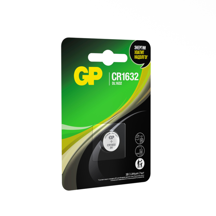 GP CR1632 3V Lithium Coin — литиевая дисковая батарейка для компактных электронных устройств. Упаковка: 1 шт в блистере (BL1). Обеспечивает стабильное напряжение, длительный срок хранения до 10 лет и надёжную работу в часах, брелоках, медицинских приборах и электронике.