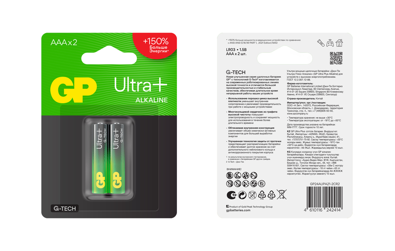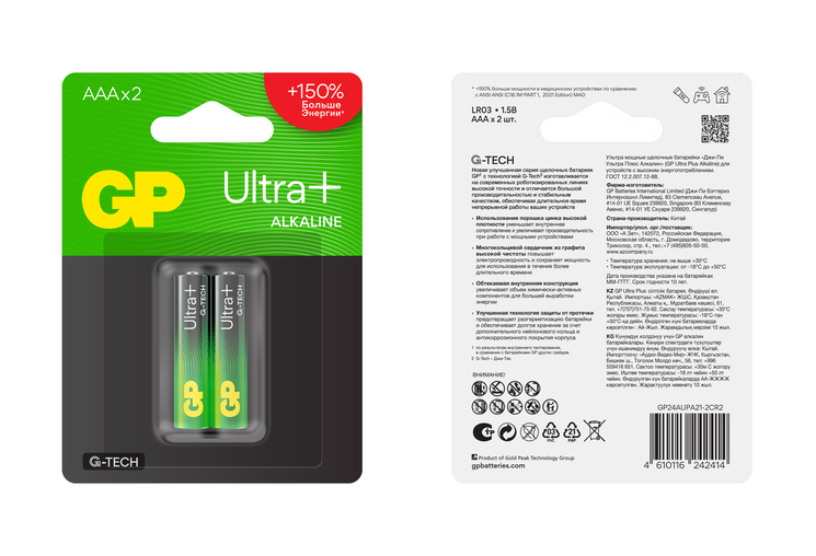Алкалиновые батарейки c технологией G-tech GP Ultra Plus Alkaline 24А AАA - 2 шт. на блистере