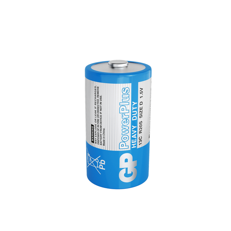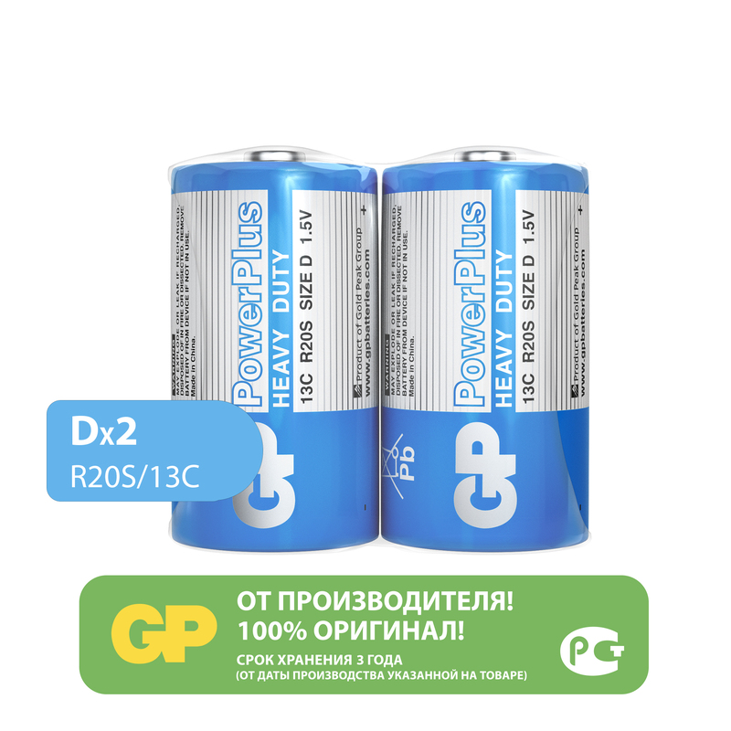 GP D (R20) 1.5V Power Plus Heavy Duty — солевые батарейки марганцево-цинковой системы. Упаковка: 2 шт в термоусадочной плёнке (шринк, SR2). Подходят для устройств с низким и средним энергопотреблением. Не содержат ртути и кадмия.